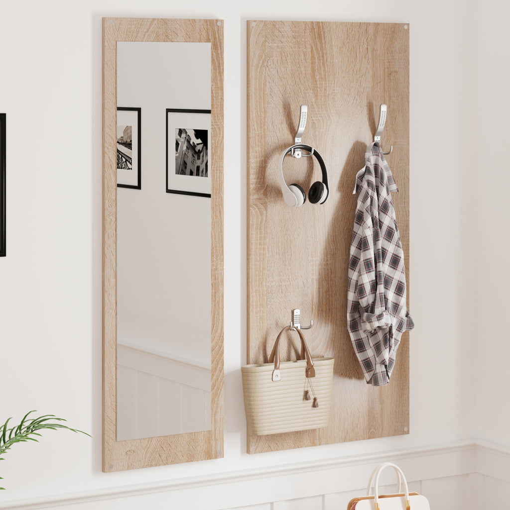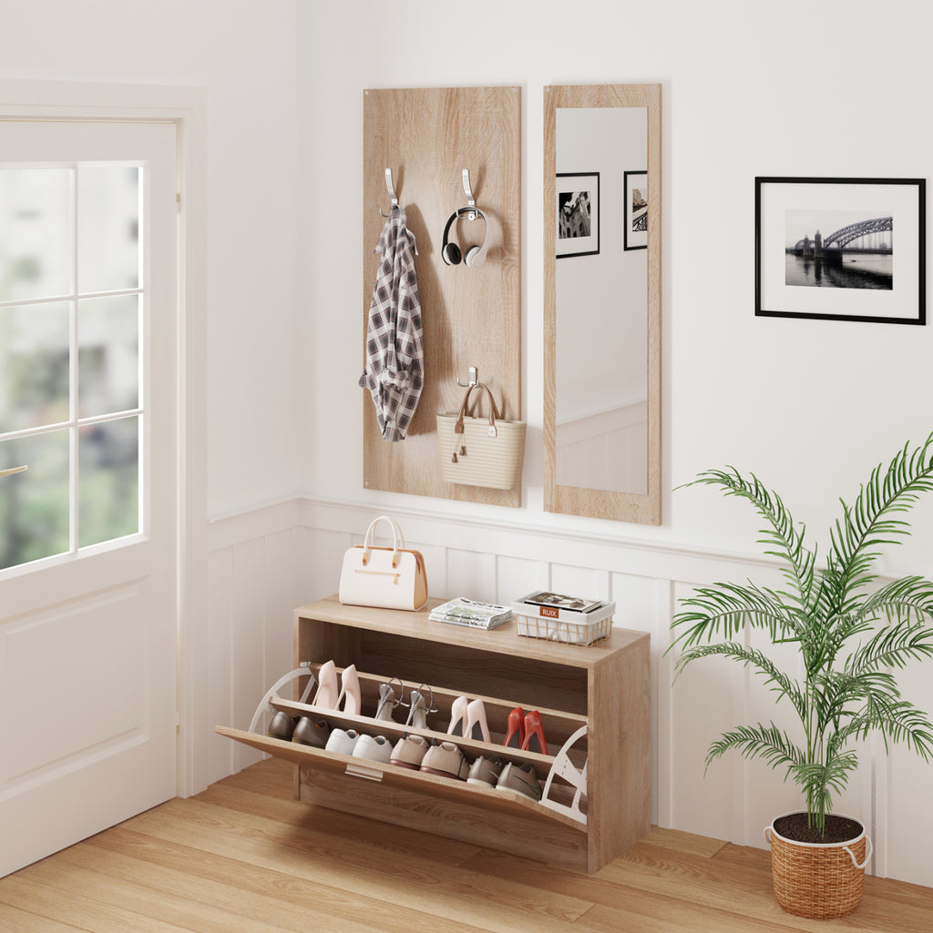 Мебелите за антре VERN се състоят от 3 бр. Класически шкаф за обувки, конструкция със закачалки като гардеробна окачена на стената и огледало до закачалките. Меламинов комплект в ефектен цвят SONAMA, който ще ви зарадва със своята практичност, тъй като всяка част е самостоятелна и може да бъде поставена където ви е удобно. РАЗМЕРИ: 80x27x175H см. МАТЕРИАЛИ НА ИЗРАБОТКАТА: Входната гарнитура е изработена от меламин с дебелина 15/12мм. Меламинът е вид дървесина под формата на ПДЧ (панел). Като материал е много издръжлив и с голяма твърдост. Така че това е синтетичен материал с много твърда повърхност, което го прави много устойчив на драскотини, абразия и петна. ПОДДРЪЖКА: Меламинът се почиства много лесно от петна благодарение на твърдата си повърхност. Можете да избършете всички повърхности с влажна кърпа и това е достатъчно. За упорити петна можете да използвате мек почистващ препарат. *Продуктът се доставя несглобен във фабрична опаковка ** Цветопредаването на продукта може леко да се различава от фотографското изображение на вашия екран.