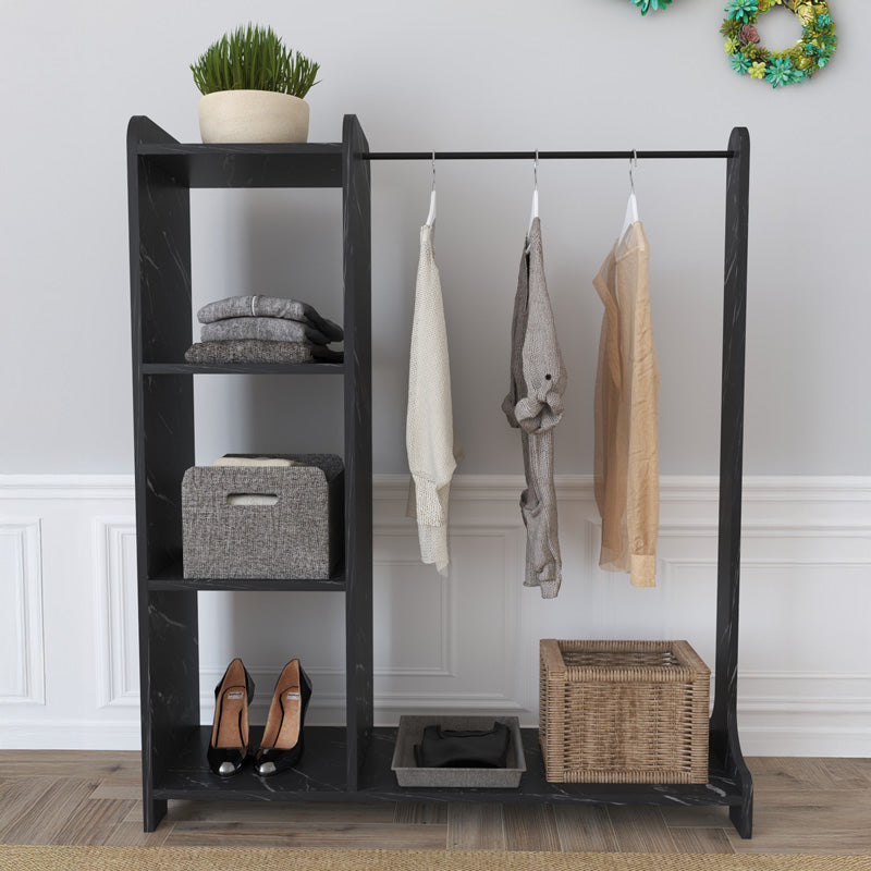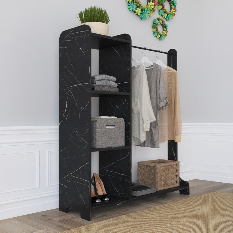 - Разполага с голям метален прът за отворено организиране на вашите палта и дрехи, както и рафтове, подходящи за съхранение на вашите аксесоари или създаване на декоративни композиции.