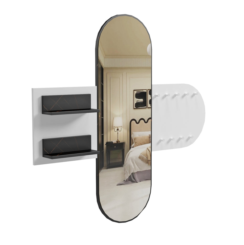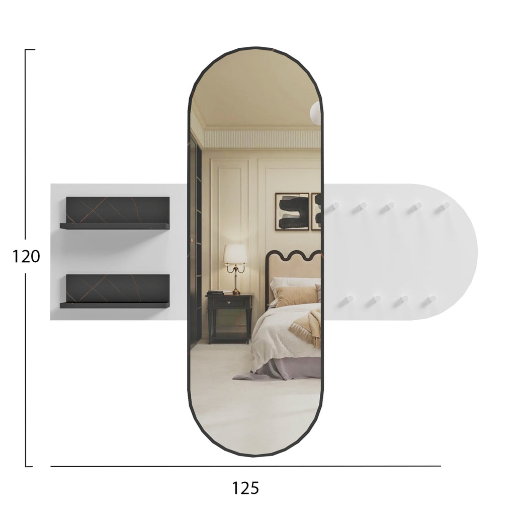 Огледалната входна закачалка CHERYL разполага с 9 закачалки за дрехи от едната страна на овалното огледало и 2 рафта в цвят ЧЕРЕН МРАМОР от другата страна. Всички мебели са меламин в БЯЛО. РАЗМЕРИ: 125x40x120Y см. МАТЕРИАЛИ НА ИЗРАБОТКА: Входната гарнитура е изработена от меламин с дебелина 15мм. Меламинът е вид дървесина под формата на ПДЧ (панел). Като материал е много издръжлив и с голяма твърдост. Така че това е синтетичен материал с много твърда повърхност, което го прави много устойчив на драскотини, абразия и петна. ПОДДРЪЖКА: Меламинът се почиства много лесно от петна благодарение на твърдата си повърхност. Можете да избършете всички повърхности с влажна кърпа и това е достатъчно. За упорити петна можете да използвате мек почистващ препарат. *Продуктът се доставя несглобен във фабрична опаковка ** Цветопредаването на продукта може леко да се различава от фотографското изображение на вашия екран.