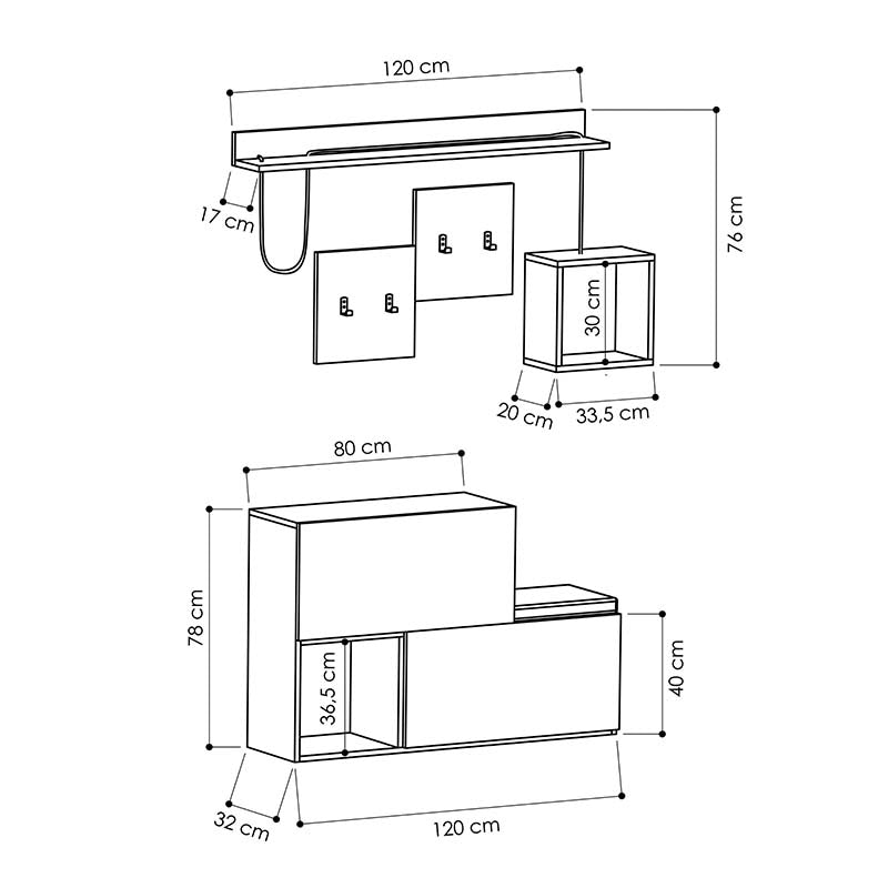 - Включва: два шкафа, рафтове с кутия форма, закачалки и мека възглавничка за сядане.