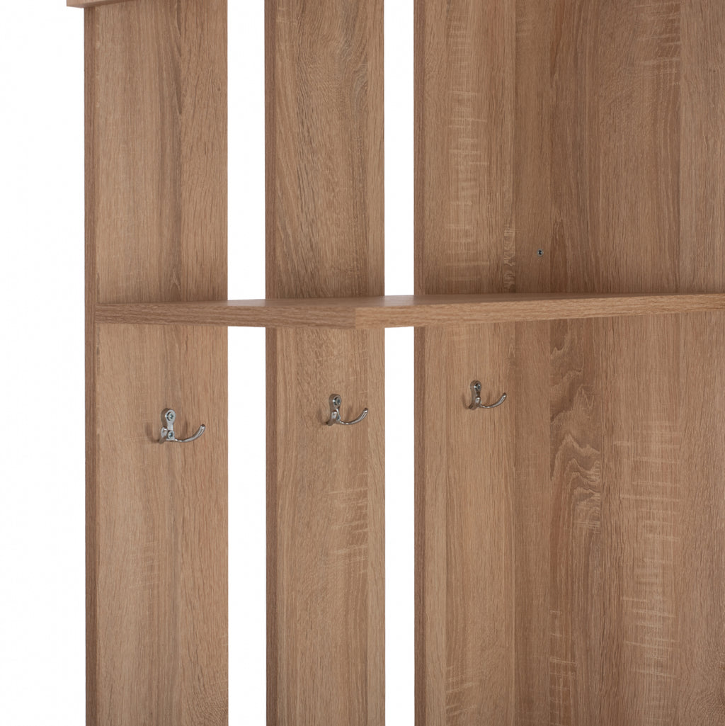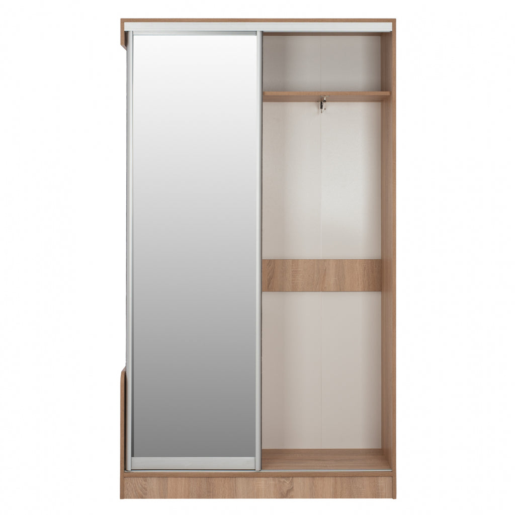 Мебел за антре с огледало в нюанс сонама 120х45х210см. Мебелна композиция, която съчетава от дясната страна гардероб с плъзгащ се гардероб с голямо огледало отвън, а от вътрешната страна има 1 рафт в горната част и вертикално плъзгаща се навън щанга за окачване, която улеснява окачването на дрехите. От лявата страна има рафт за съхранение в горната част, място за закачалки и 4 рафта за съхранение на дребни предмети в долната част. Гъвкав и практичен, той е най-доброто предложение за декорация и организация в приемната на вашия дом. Изработен от висококачествен 18 мм меламин с устойчивост на натоварване и износване. Размери: 120х45х210см. Размери на малки рафтове: 28x40x18 см. Размери на отворена повърхност: 57x38 см. Размери на горен външен рафт: 57x30x34 см. Размери на горен вътрешен рафт: 57x40x30 см. Размери на огледалото: 52х185см. Европейско производство и произход. Продуктът се предлага разглобен във фабрична опаковка.