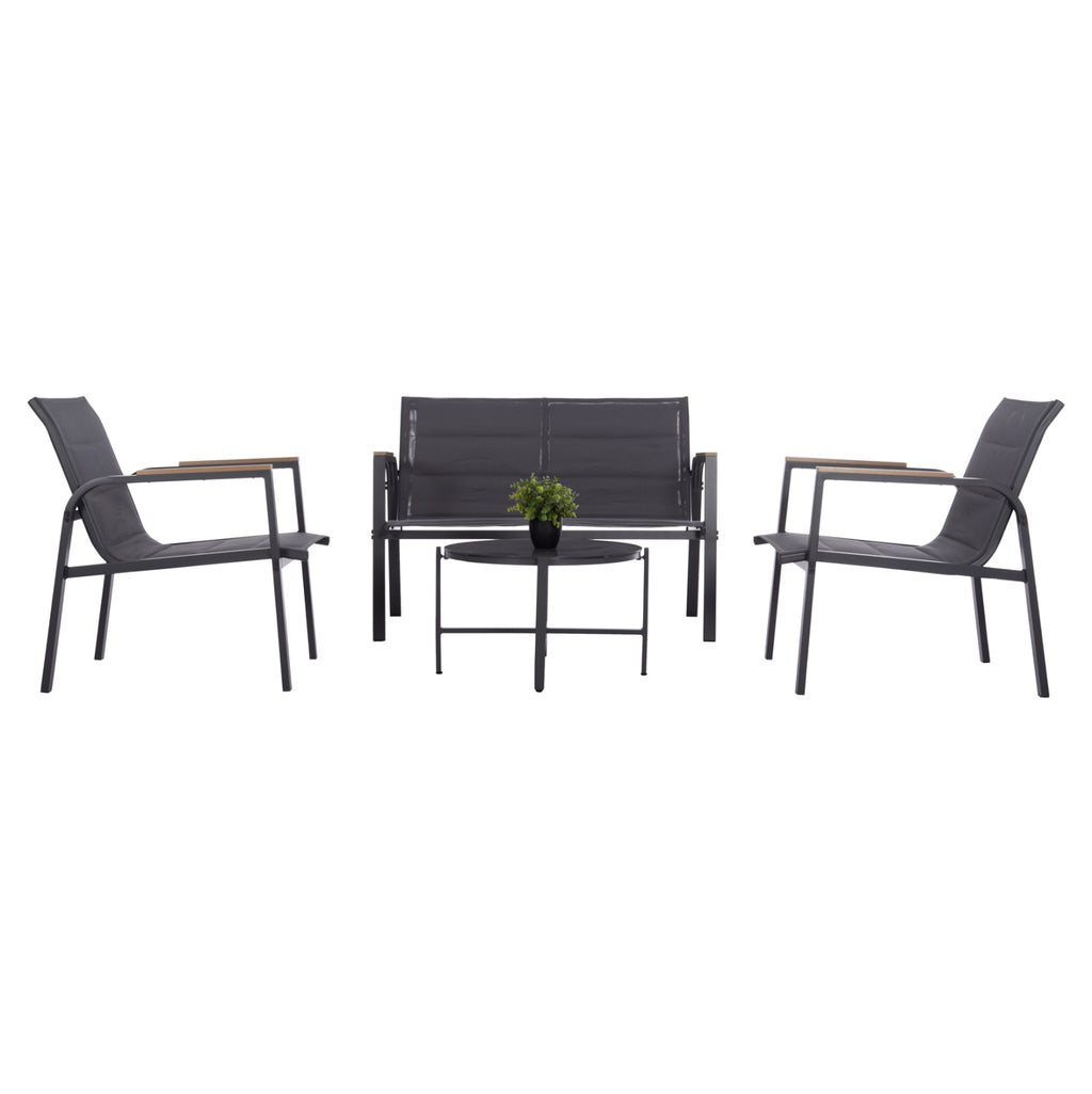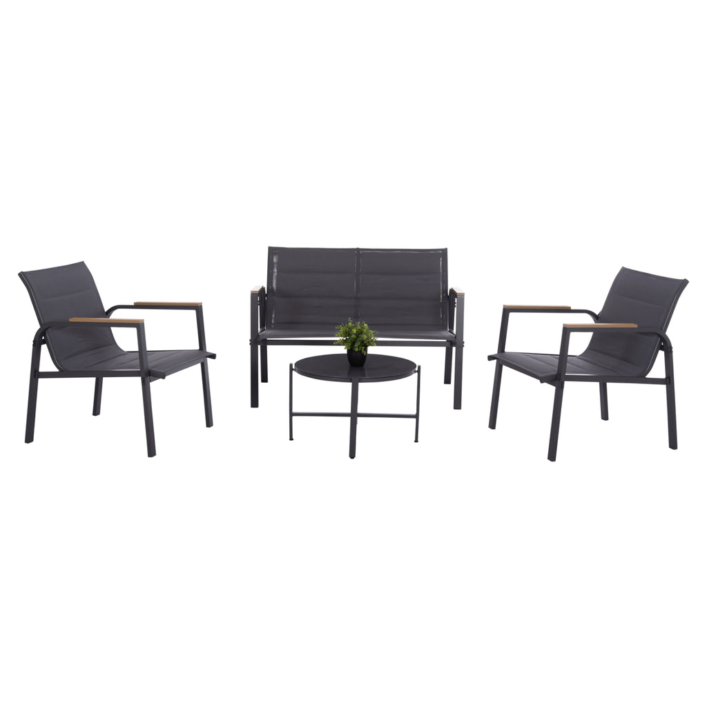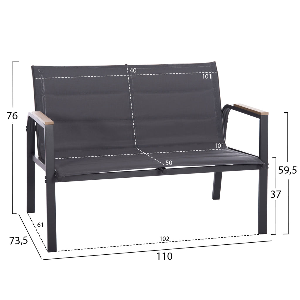 Рамките на мебелите са изработени от висококачествен алуминий, покрит с електростатична прахова боя. Това гарантира дълготрайна защита срещу корозия, влага и UV лъчи, като същевременно поддържа изящен външен вид. Седалките и облегалките са изработени от подсилен текстилен плат (textilene 2x1), който е водоустойчив и устойчив на износване. Благодарение на вградения пълнеж от пяна, комплектът осигурява отличен комфорт при продължителна употреба.
