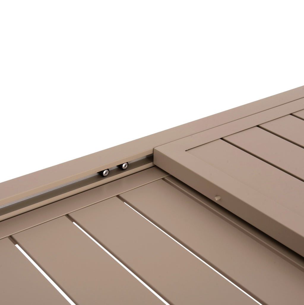 Този външен трапезен комплект се състои от алуминиева разтегателна маса в цвят капучино и 6 алуминиеви фотьойла CHAMPAGNE. Фотьойлите могат да се стифират. РАЗМЕРИ: МАСА: 160-240x90x73H см. Разстояние между краката: 148x80 см. Алуминиеви спецификации: 60x60x1.2mm---- 65x35x1.5mm КРЕСЛА: 63x58x85H cm. Размери на седалката: 38х42 см. Размери на гърба: 44.5х45 см. Височина на ръцете: 63,5 см. Височина на седалката: 44,5 см. Височина на крака: 35 см. Разстояние на краката: 48-53x52-56 см. Височина на крака отзад: 43-47,5 см. Размери на алуминиева рамка: Φ25mm x T1.5mm Размери на алуминий на задната седалка: 40mm x 4mm КОНСТРУКТИВНИ МАТЕРИАЛИ: МАСА И ФЪТЬОЬОЛИ: -Алуминий с електростатично боядисване. Електростатичното боядисване е процес на сухо прахово боядисване на боя, използвана като метално покритие. ПОДДРЪЖКА: Достатъчно е забърсване с влажна кърпа. Не използвайте химически почистващи препарати. Масата се доставя в несглобен вид и се сглобява лесно, тъй като всички необходими части са включени в опаковката.