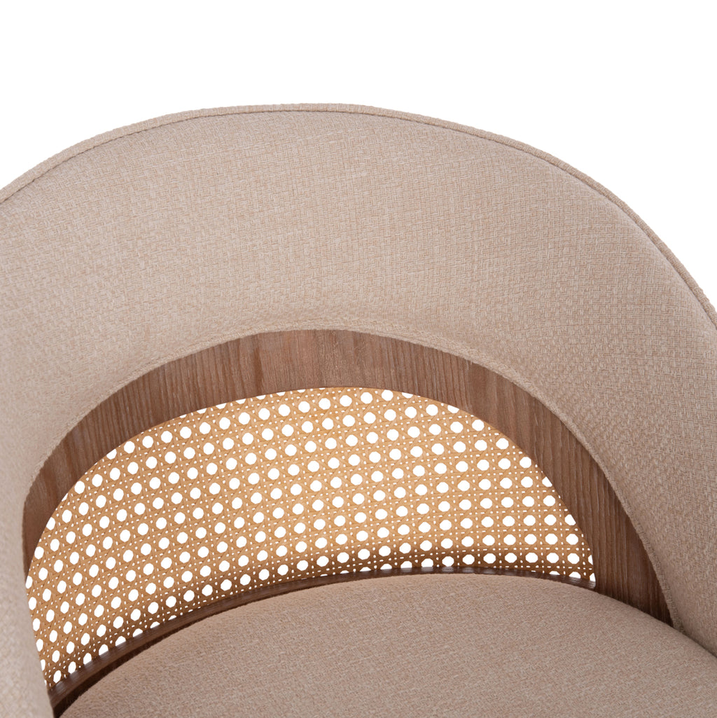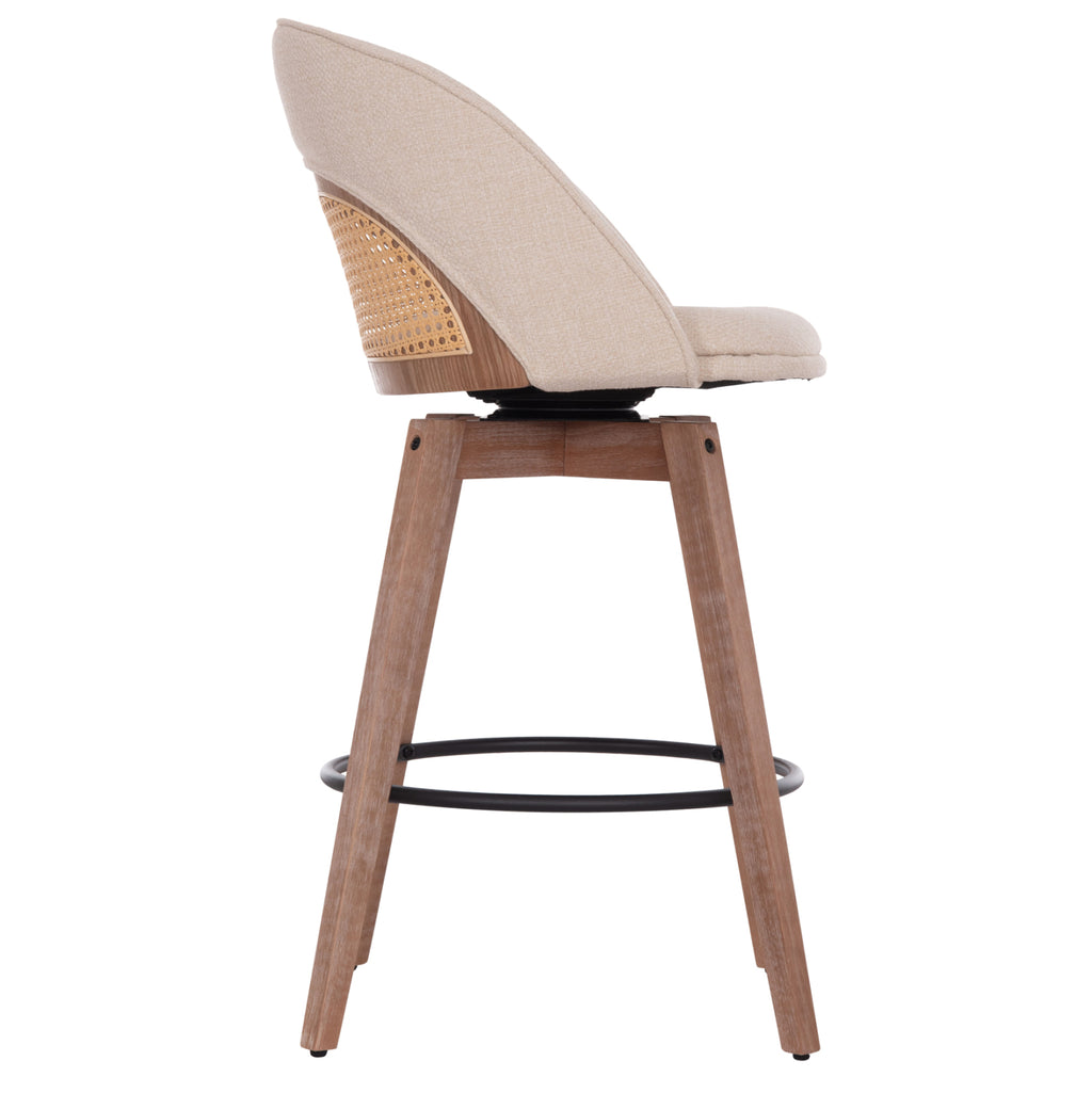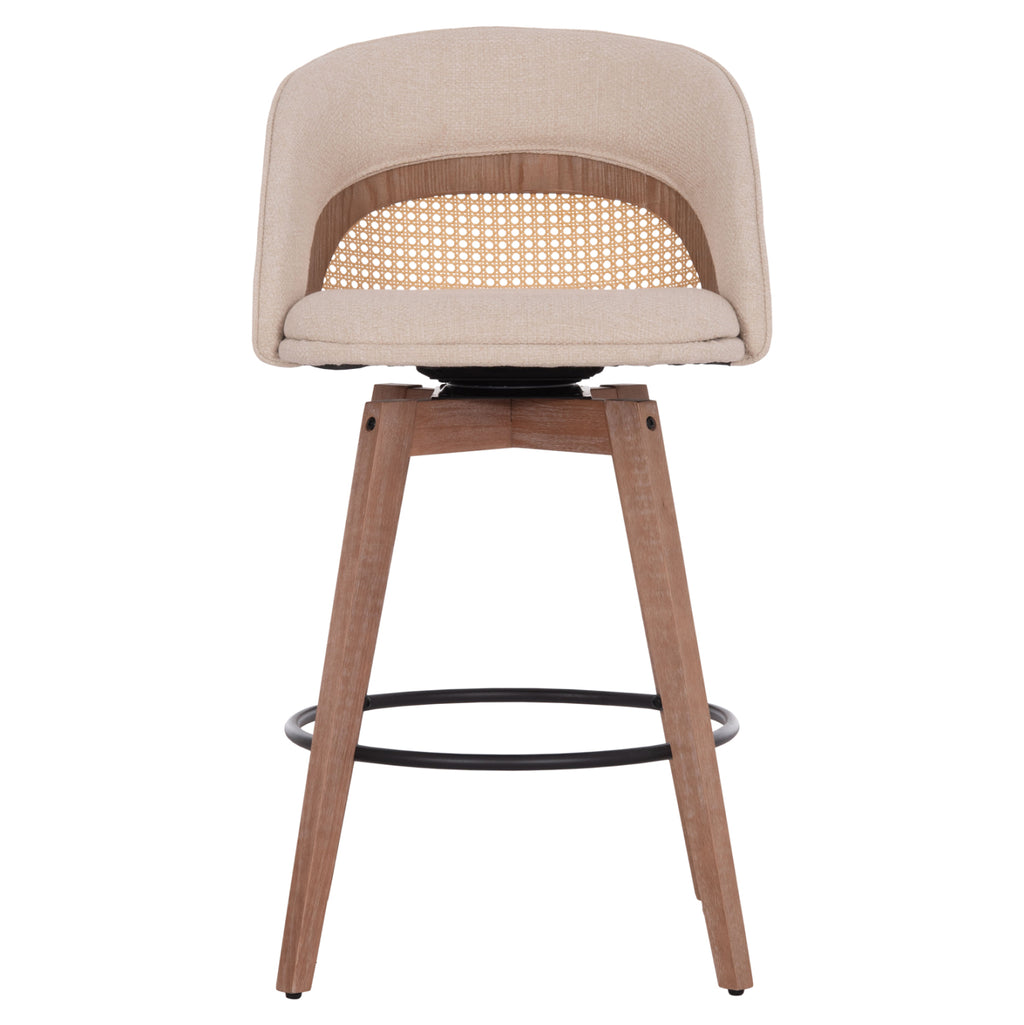 Въртящият се бар стол RIKI със средна височина е друго отлично предложение, предимно за професионални пространства. Краката са дървени в цвят WHITEWASH, а облегалката и седалката са тапицирани с качествен плат в цвят BEIGE. Бежовият “мрежест” детайл на облегалката помага да се запази “хладно” по време на употреба. В долната част на краката има регулатори за регулиране на стабилността на стола, като същевременно има и поставка за крака, която свързва 4-те крака в кръг.