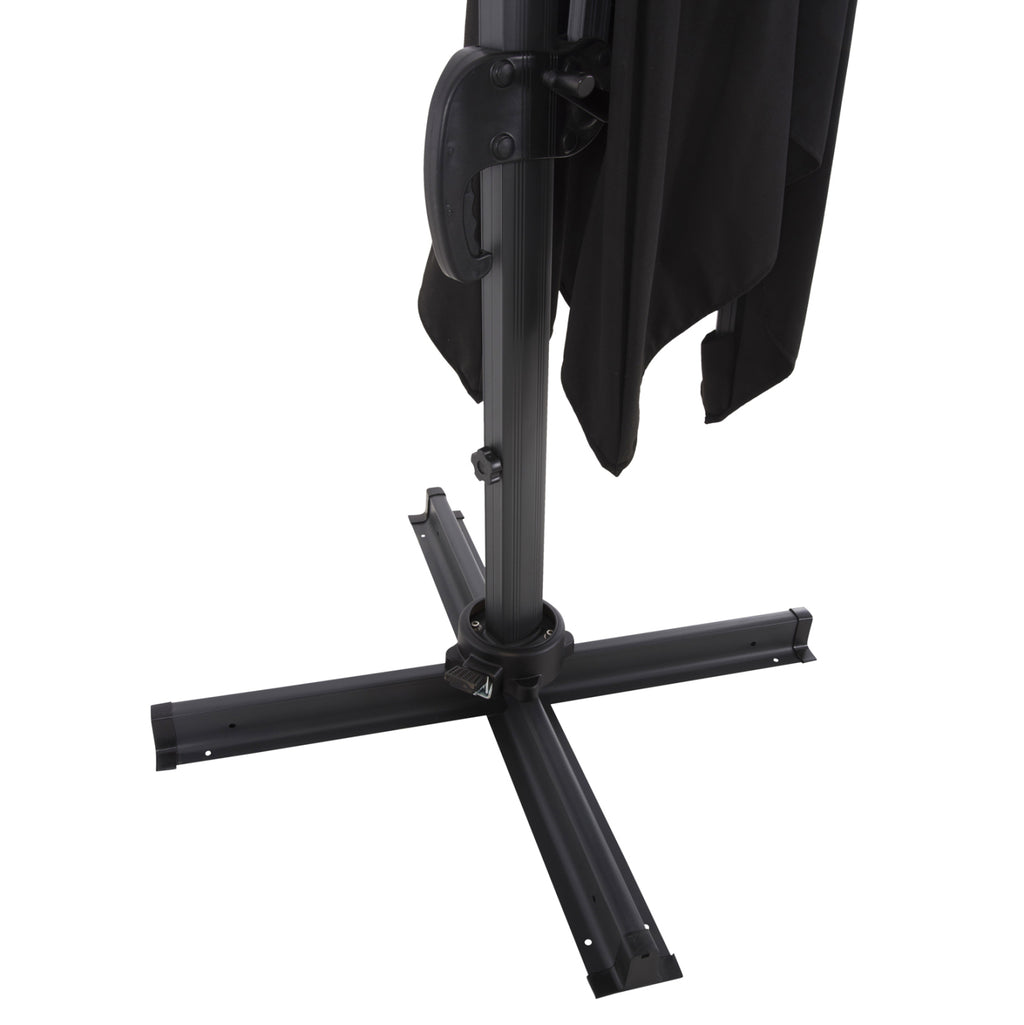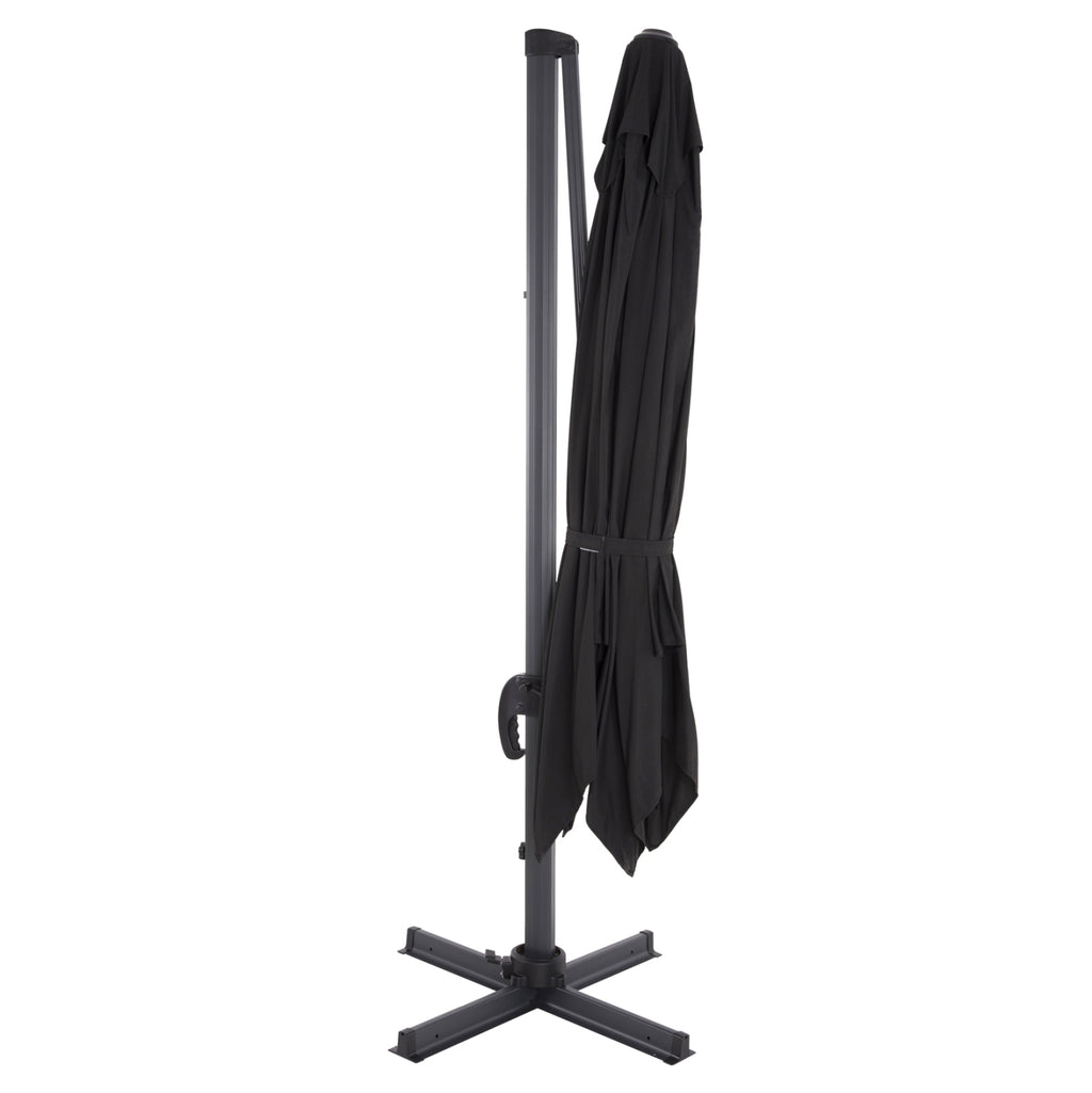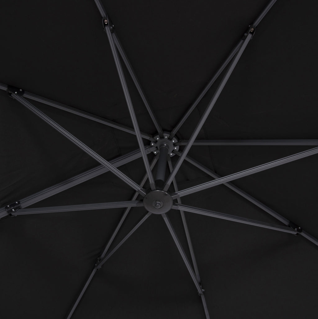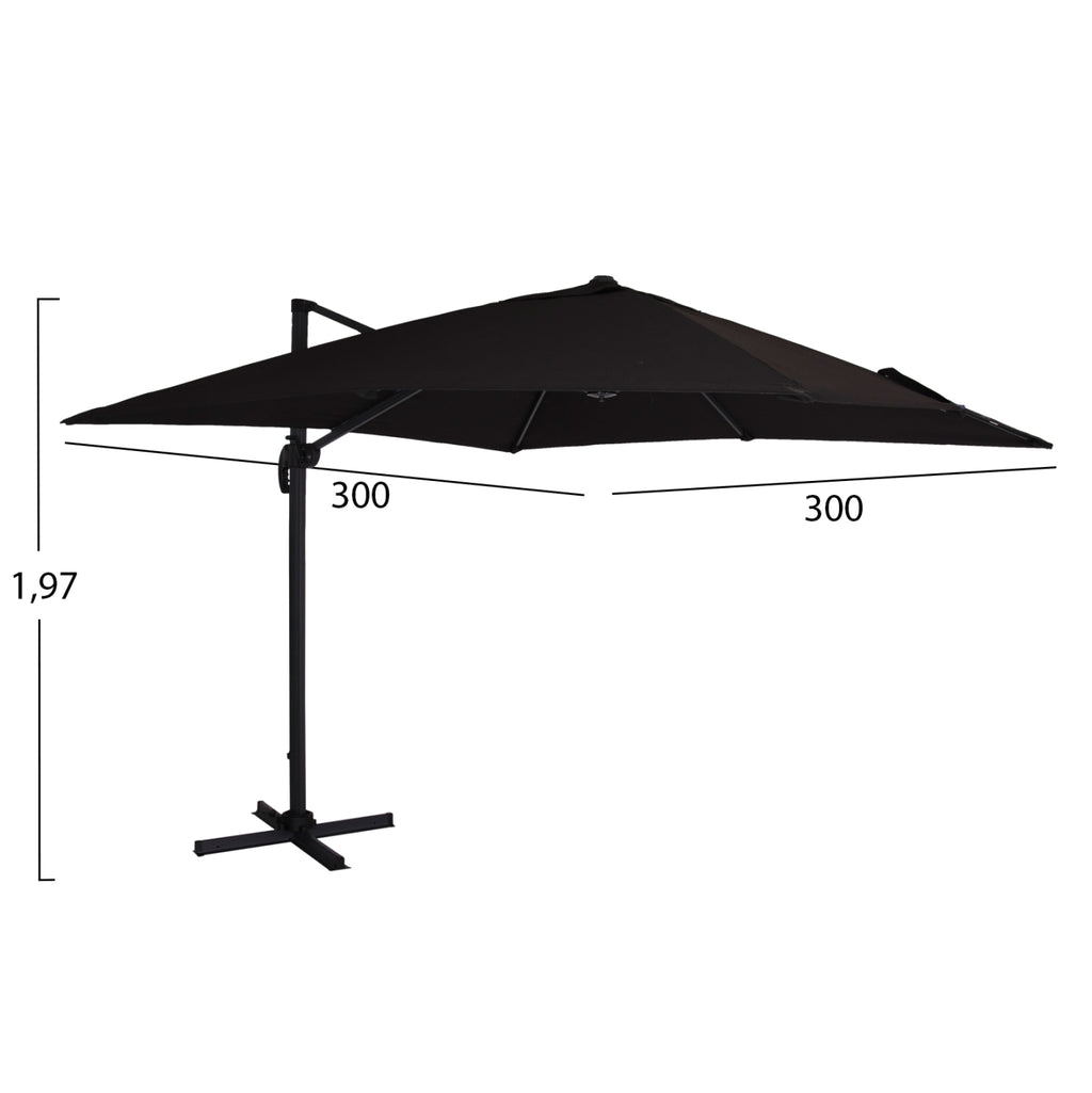 Професионален алуминиев чадър, въртящ се на 360 градуса 3х3м. с черен плат. С алуминиева рамка с диаметър 53х77мм, с 8 алуминиеви спици 14х24см. с вътрешна армировка. Макс височина 1,97 Мин височина 1,05 Водоотблъскващ акрилен плат 250 грама. Цвят на рамката: Сив. Подходящ за плажни заведения и за всякаква професионална употреба. Чадърът е подходящ за използване при ясно време. При нестабилно време чадърът трябва да бъде затворен. Чадърът не подлежи на ремонт.