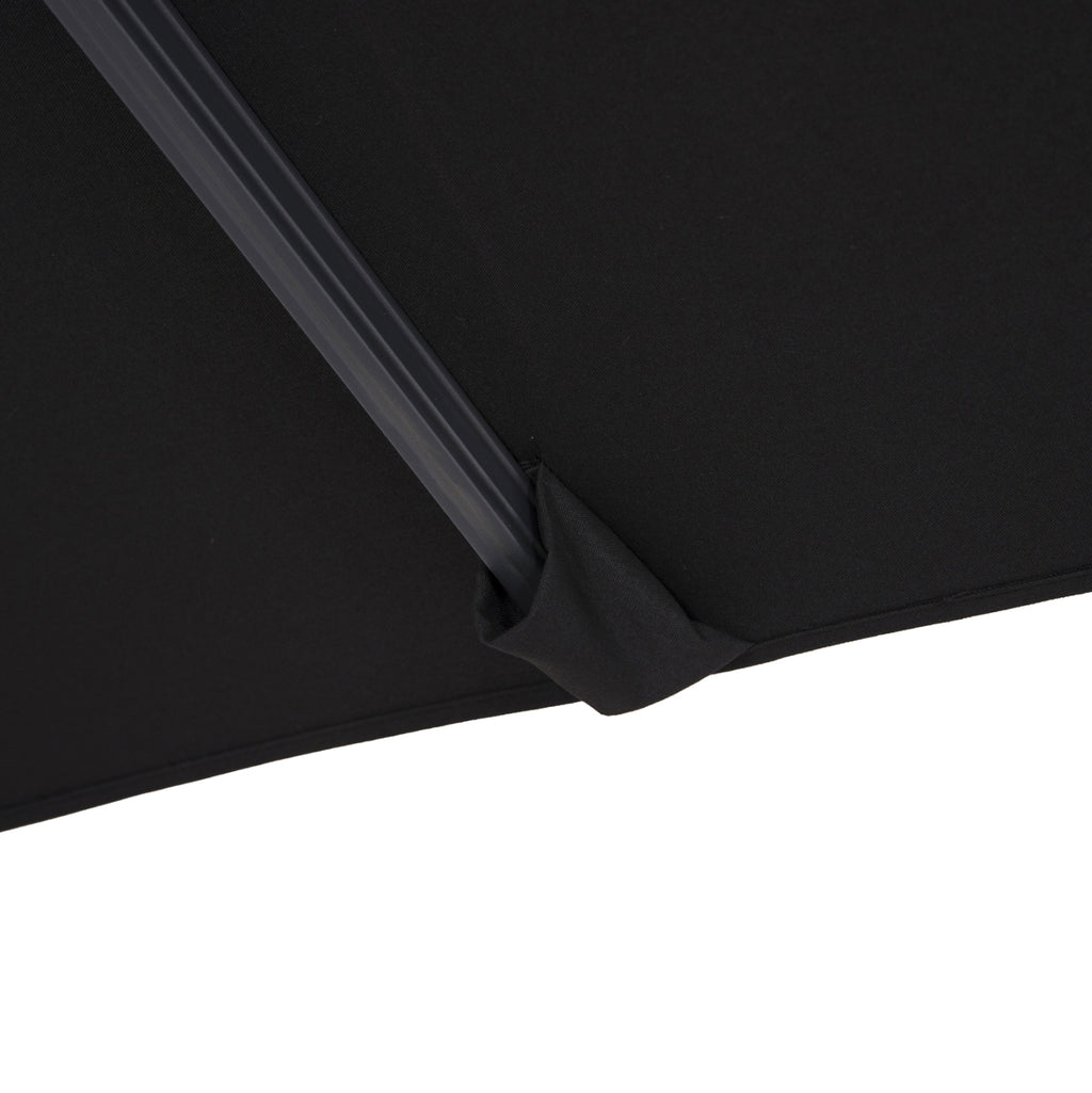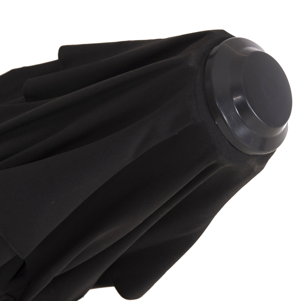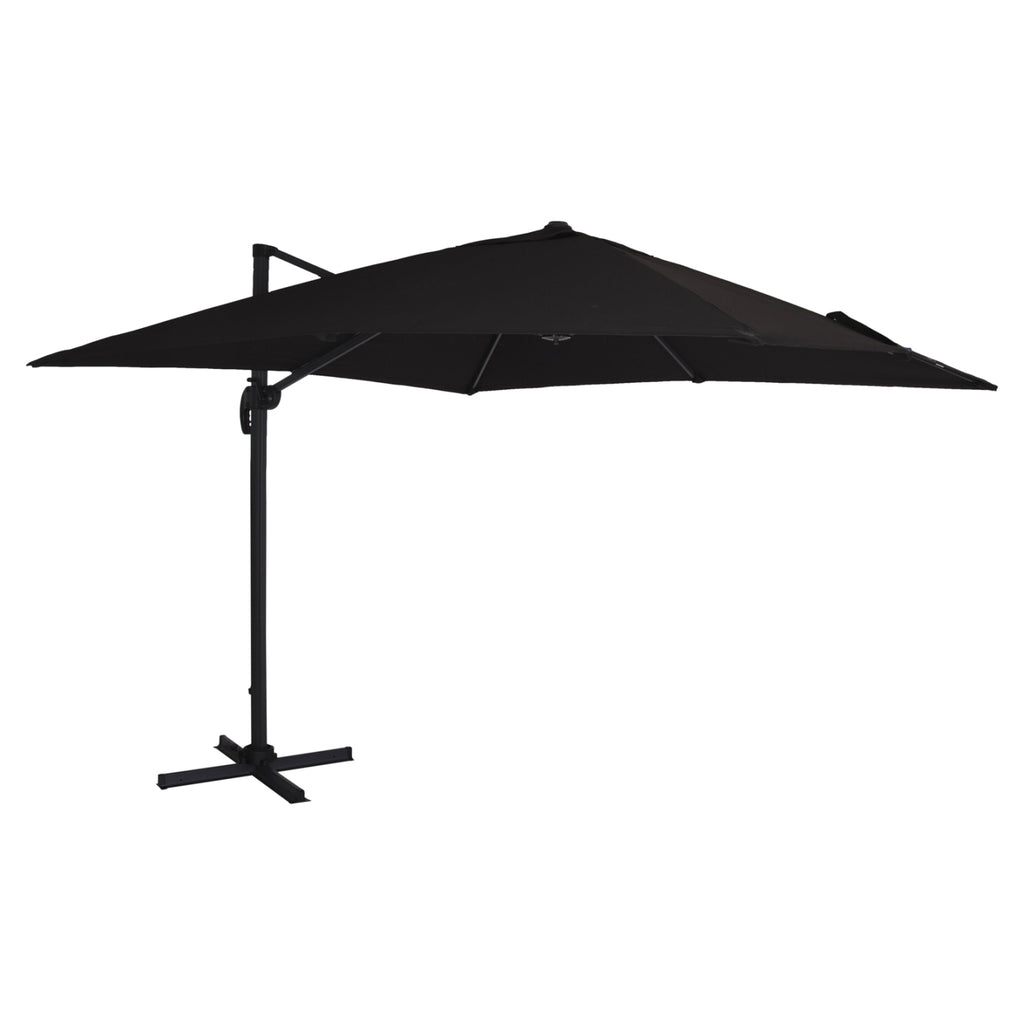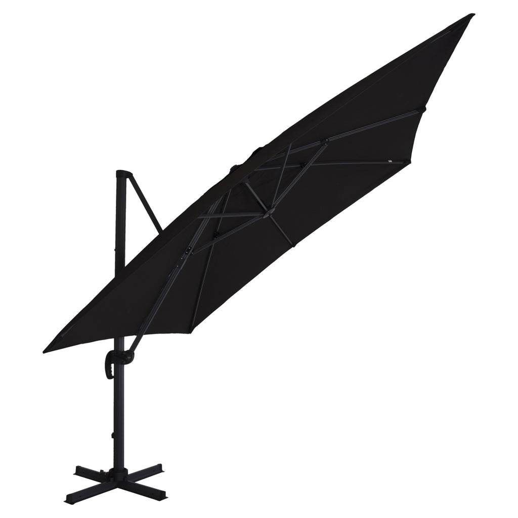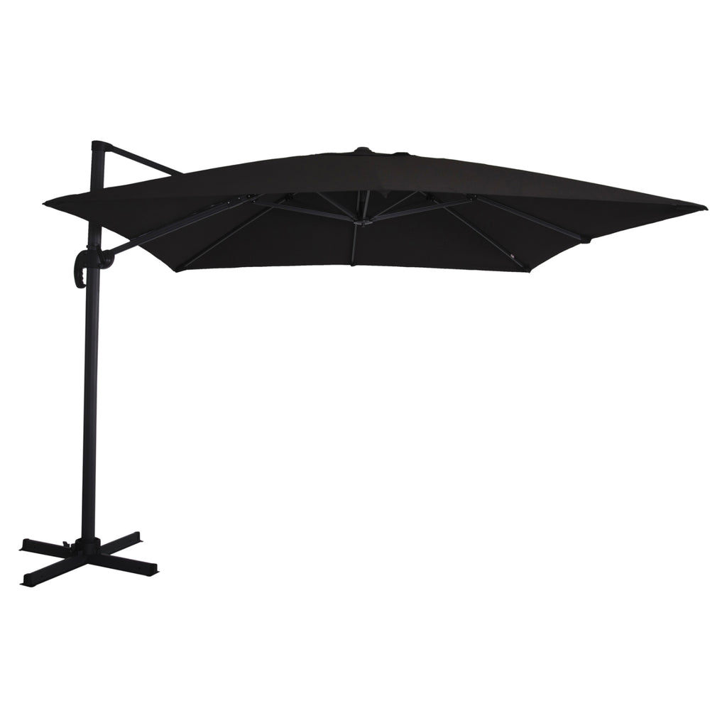 Професионален алуминиев чадър, въртящ се на 360 градуса 3х3м. с черен плат. С алуминиева рамка с диаметър 53х77мм, с 8 алуминиеви спици 14х24см. с вътрешна армировка. Макс височина 1,97 Мин височина 1,05 Водоотблъскващ акрилен плат 250 грама. Цвят на рамката: Сив. Подходящ за плажни заведения и за всякаква професионална употреба. Чадърът е подходящ за използване при ясно време. При нестабилно време чадърът трябва да бъде затворен. Чадърът не подлежи на ремонт.