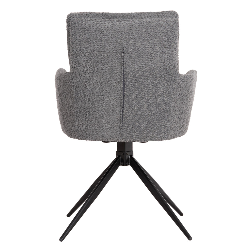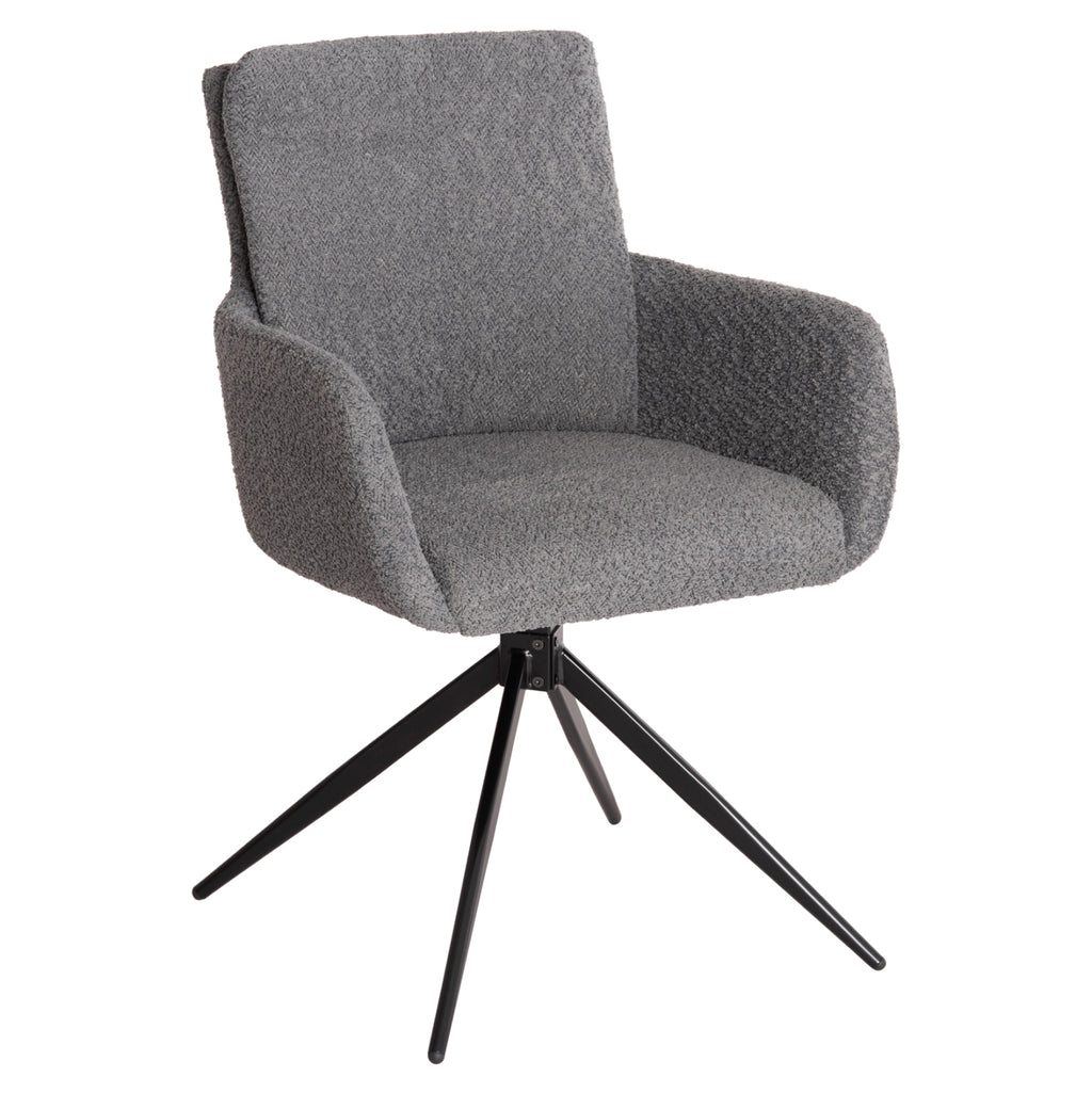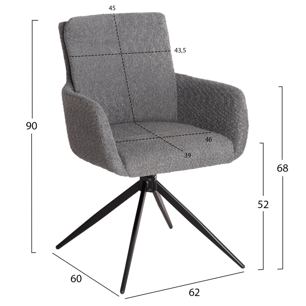 BLANS е въртящо се трапезарно кресло в СИВ цвят и е едно от новите попълнения в нашата гама. Той лежи върху черна метална четиризъба основа (крака), върху която е монтиран шарнирният щифт. Тапицерията на фотьойла е изработена от висококачествена дамаска букле, а седалката е удобна, отговаряща на характера на креслото, което е модерно съчетаващо стил и комфорт. РАЗМЕРИ: 62x60x90H см. Размери на седалката: 46х39 см. Размери на гърба: 43.5х45см. Височина на ръцете: 68 см. Височина на седалката: 52см. Височина на крака: 41,5 см. Разстояние на краката: 52-48x55-51 см. МАТЕРИАЛИ НА ИЗРАБОТКА: "Пълнежите" на фотьойла, както на облегалката, така и на седалката, са изработени от дунапрен със средна твърдост, който предлага голям комфорт и по-добра опора на тялото. Цялата подплата е изработена от висококачествена материя BOUQUEL. Всяка тъкан, която има извиване на възел, се нарича букле. Изработено е от почти всички суровини (въпреки че обикновено е синтетично) със специални възли или силно усукани конци, така че да има къдрава повърхност. Не се мачка и може да бъде изчистена, меланжирана, карирана или туид. ПОДДРЪЖКА: Платът от букле можете да избършете с прахосмукачка, а при петна използвайте леко влажна кърпа. ** Цветопредаването на продукта може леко да се различава от неговото фотографско представяне на вашия екран. Продуктът се доставя разглобен във фабрична опаковка