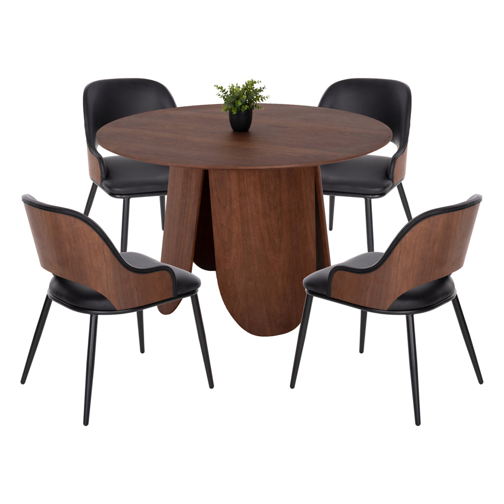 Този комплект за хранене за вътрешно ползване се състои от маса DENTY и 4 стола DELF. DENTY е кръгла маса за хранене с скосен MDF плот с дъбов фурнир в цвят ОРЕХ. Този плот е поставен върху красива дървена цилиндрична основа в същия цвят. Столовете DELF имат ЧЕРНА PU тапицерия и ЧЕРНИ метални крака. Това, което се откроява обаче, е, че цялата облегалка е изработена от дърво в цвят ОРЕХ и е извита и удобна. РАЗМЕРИ: МАСА: Φ120x75H см. Дебелина на повърхността: 2 см. Височина на краката: 73,5 см. Размери на основата: Φ74 см. СТОЛОВЕ: 48x55x76H см. Височина на седалката: 45 см. Височина на подлакътниците: 52 см. Размери на седалката: 37-41x46 см. Размери на облегалката: 46x27-35 см. Разстояние между краката: 43x53 см. Височина на краката: 39 см. Височина на краката на гърба: 43 см. МАТЕРИАЛИ ЗА ИЗРАБОТКА: Маса: Цялата маса е изработена от MDF с дъбов фурнир. Столове: Краката са метални, облегалката е дървена, а седалката и облегалката са изработени от PU синтетична кожа. *Комплектът се предлага несглобен във фабрична опаковка. **Цветовото представяне на комплекта може леко да се различава от фотографското му изображение на вашия екран.
