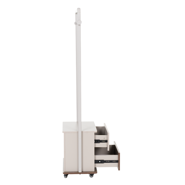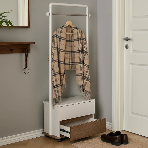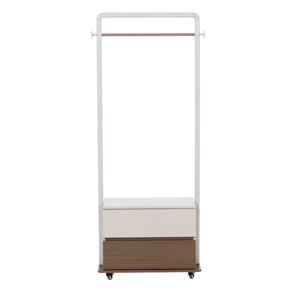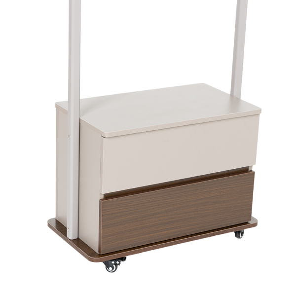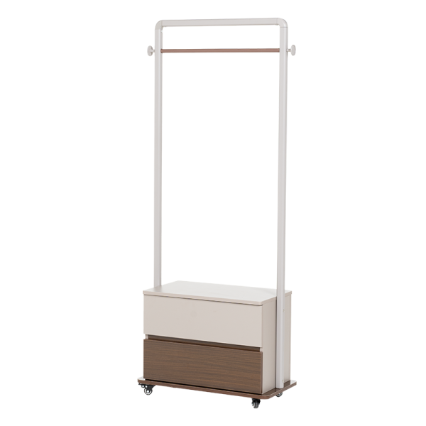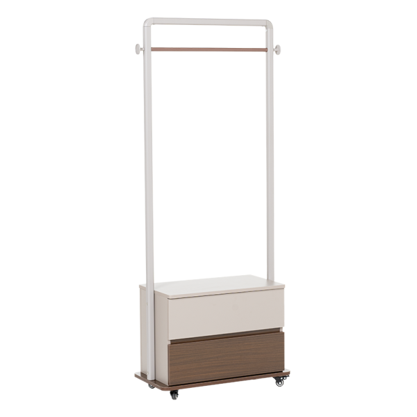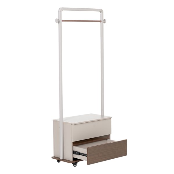 Закачалка с шкаф PASAU съчетава стил и практичност в едно компактно решение. Разполага с 1 метален лост за закачалки, 2 чекмеджета за съхранение на дребни вещи и удобна мобилност благодарение на вградените колелца. Перфектно допълнение за антре, спалня или гардеробна.